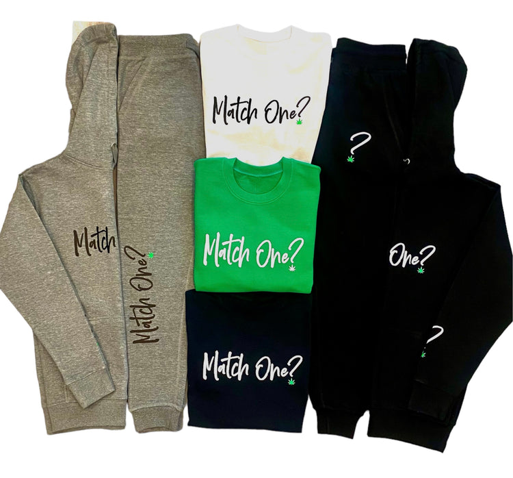 Match One collection consists of (2) Hoodie sweatsuits, (1) crew neck sweatshirt, & (2) L/S tees
